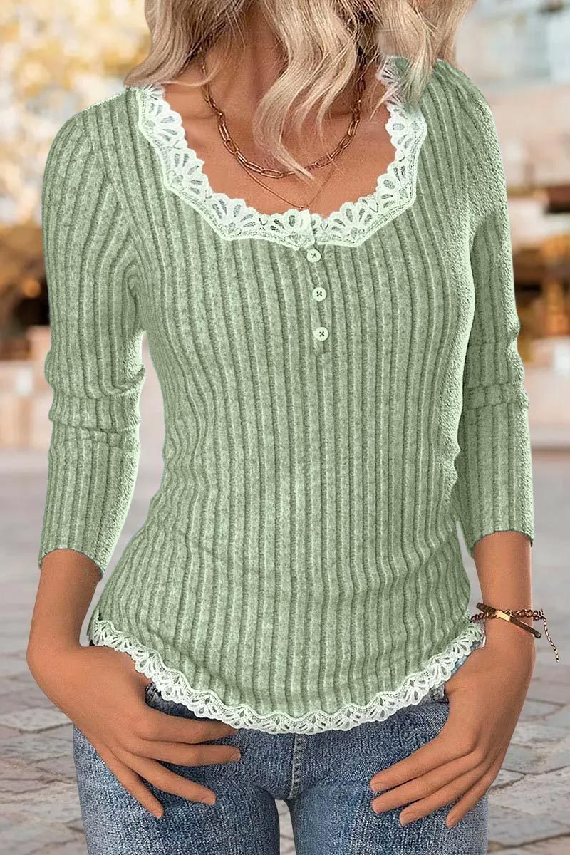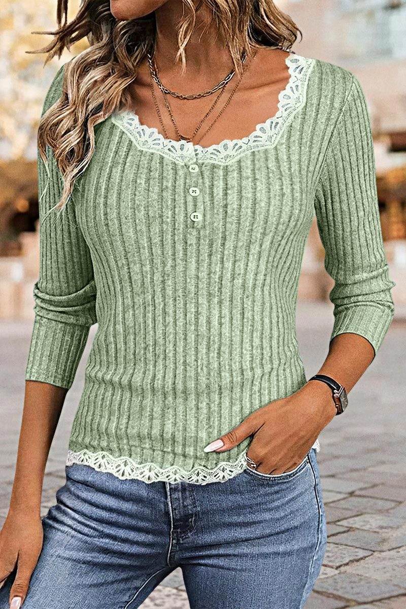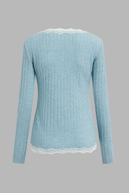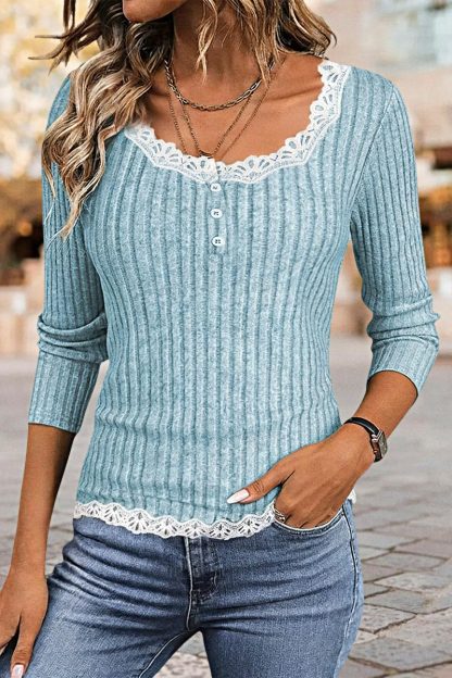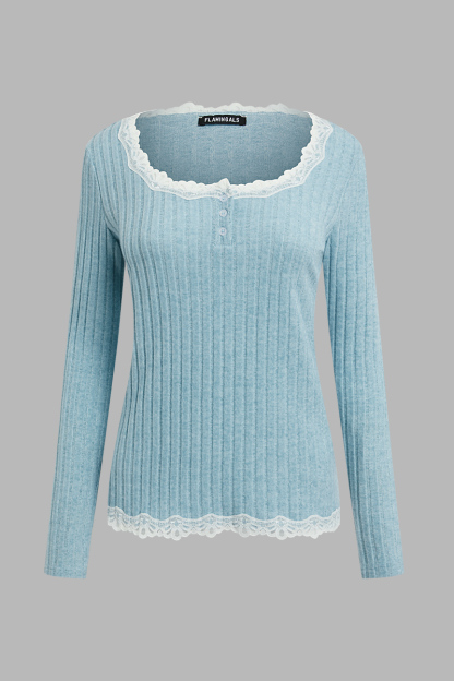 Contrast Lace Rib-Knit Button Front Scoop Neck Long Sleeve T-Shirt