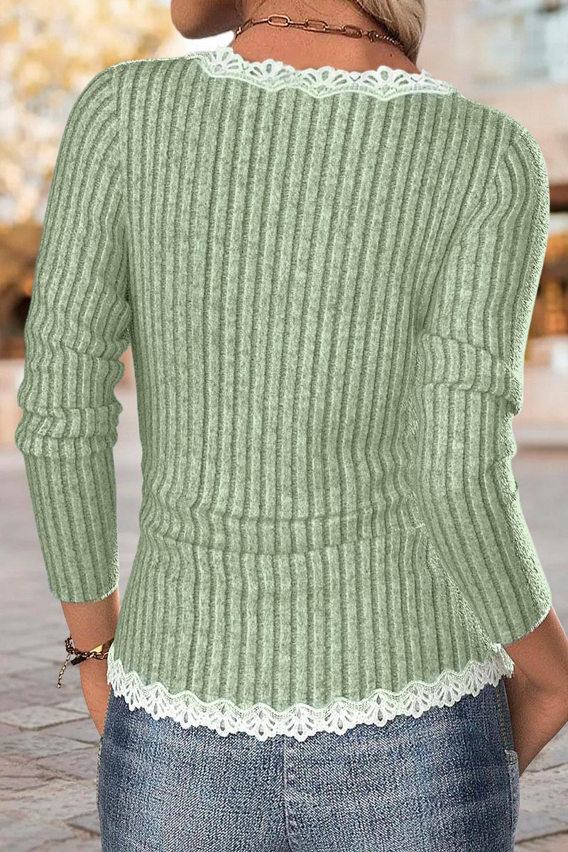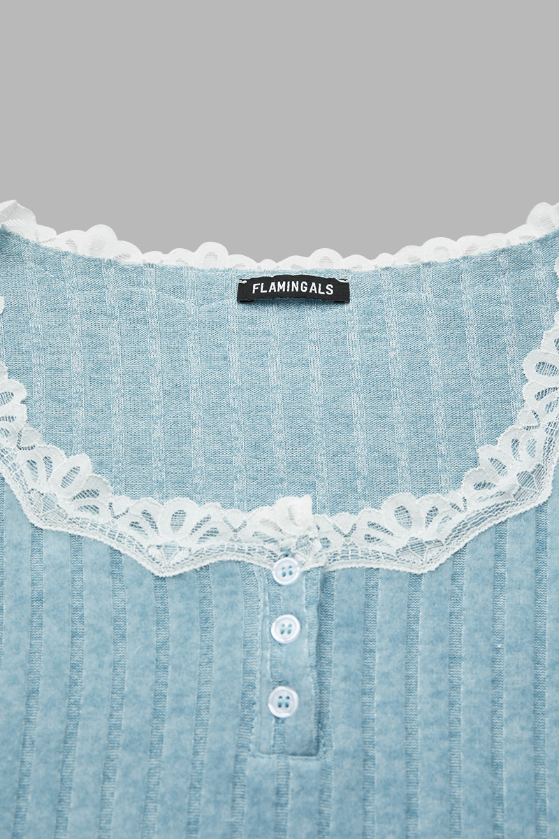 Details:  Rib-Knit is characterized by its distinctive columns of stitches that alternate between knit and purl patterns, providing a snug fit, and an appealing ribbed appearance; Contrast lace, a detailing technique combines diverse lace patterns or hues, resulting in an extra layer of refinement to garments; Button design makes it more fun and vertical