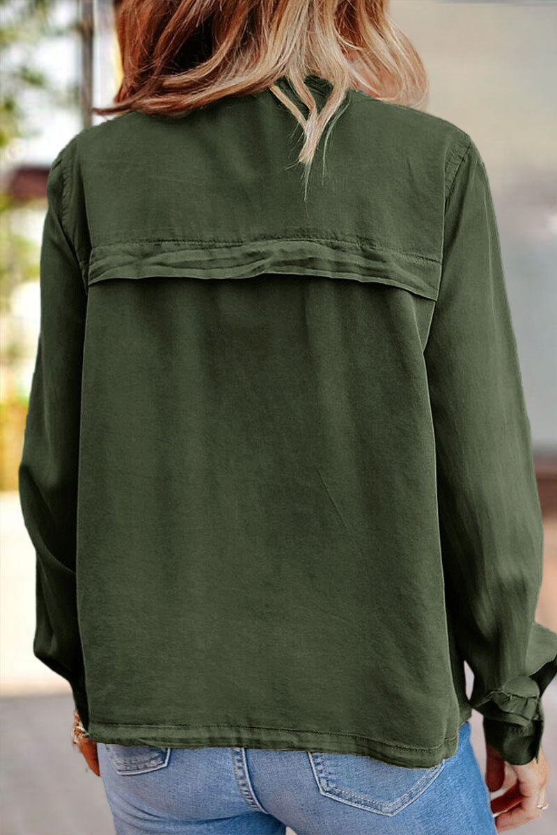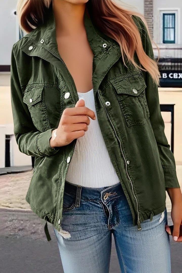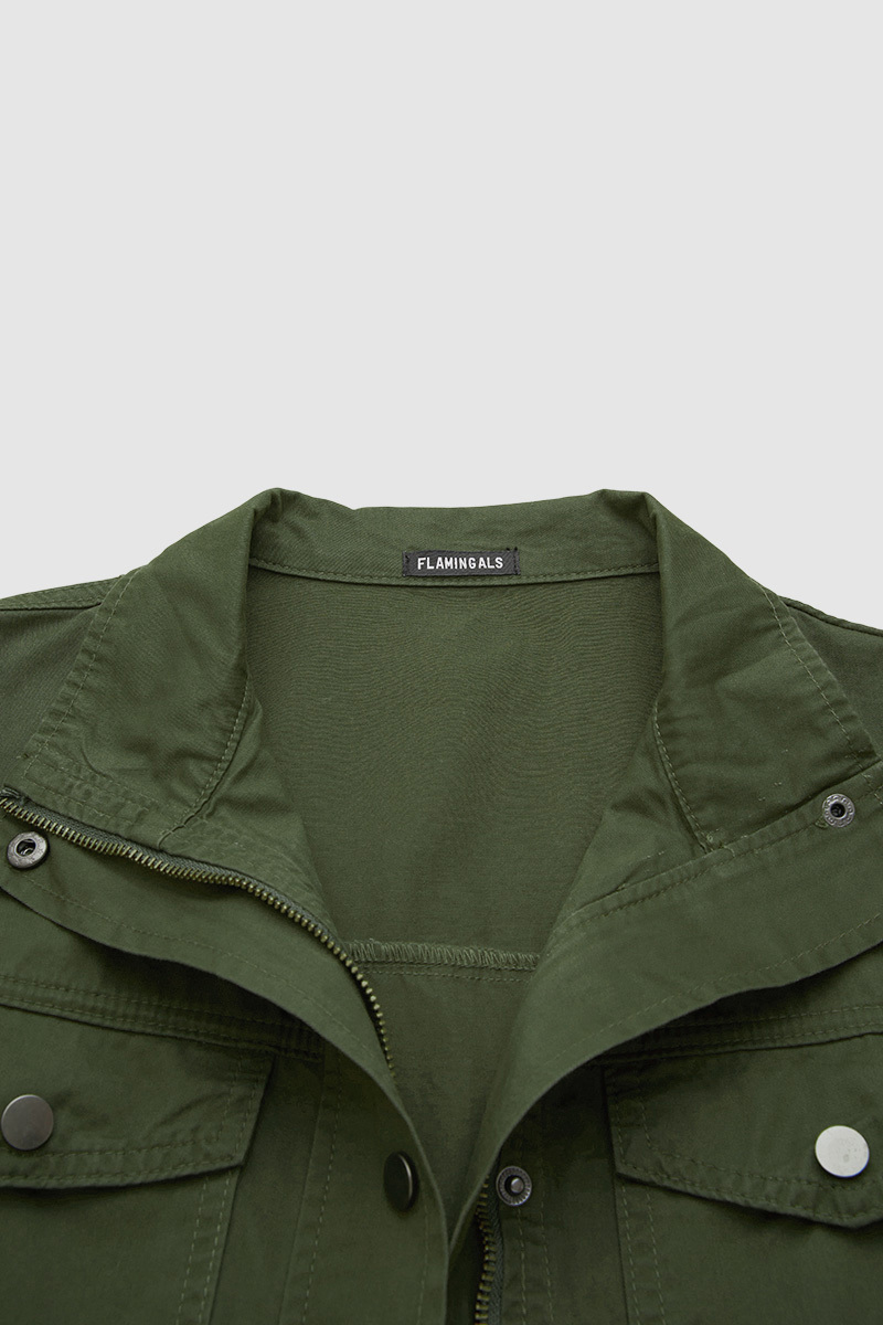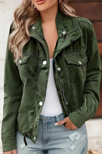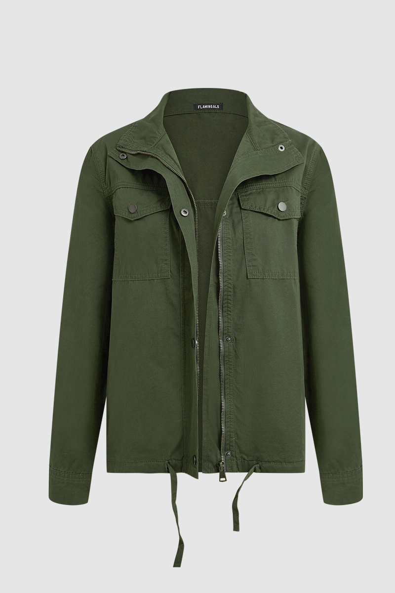 Neckline:  Stand collar stands up around the neck, providing a structured and tailored feel and creating a more elongated silhouette